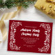 A simple family Christmas party invitation showcasing hand drawn white winter greenery on a dark red background.