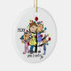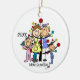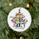 A cute, fun ceramic Christmas holiday ornament featuring a stick figure expectant moms couple, toddler boy and girl, holiday tree, and text that reads "We're Expecting!" with an area you can add the current year!