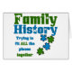 'Family History, trying to fit all the pieces together' - and the text is written in puzzle pieces with a few pieces missing in the words and tumbling down the design. Clever design for anyone working with the family tree and roots of their ancestors.