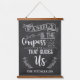 This hanging tapestry sign is made to resemble chalkboard art. The background is an image from a chalkboard, with white text to mimic chalk writing. The family quote is welcoming in any home, and can be personalised with a family's last name. Makes a great gift for weddings, birthdays, mother's day, or any day! Created by Simply Farmhouse Press.