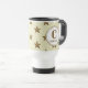 This monogram travel mug is a great way to create a special touch to your morning. A gold star pattern appears against a beige background. Your monogram is featured in gold western font along with the family name. Easily customise the colours and monogram initial to suit your desire.