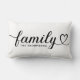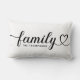 Modern and stylish custom lumbar throw pillow design features simple and minimal "Family" typography that includes flourish and heart details. Personalise the uppercase text below with a monogram or year established. The black and white colours can be modified.