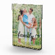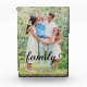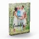 Modern and stylish custom vertical tabletop photo block features a favourite photo with a minimal "family" typography overlay design that includes elegant flourish and heart details. The black text colour can be modified.