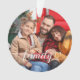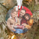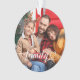 Modern and stylish custom Christmas ornament features a favourite photo(s) with a minimal white "family" typography overlay design that includes elegant flourish and heart details. The white text colour can be modified. 2 photo front / back ornament allows you to include one photo on front and back or two different photos.