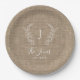 Custom elegant white monogram and name with family established year chic rustic country farmhouse style beige jute paper plates. +++++++ A modern keepsake gift for weddings, anniversaries, housewarmings, new home, Thanksgiving, Christmas, or any other occasion.