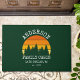 Rustic Pine Trees Summer Retro Sunset Family Name Cabin Forest Green Door Mat. Personalise with your family name, location, year or date and more.