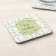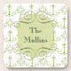 French chic mod style coasters with personalised Family Names. Green chandelier background with vintage scroll hearts accents.