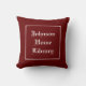 Customise this pretty dark red with elegant white script home library throw pillow with your own family's name. Or, add only a first name or just a last name, or even all new words. A classy and comfy way to establish the location of a home library, reading nook, or reading corner. This home library or reading nook accent cushion is set up with a cotton fabric cover, but there are other washable fabric choices as well.