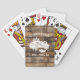 These personalised rustic lake house playing cards feature a tranquil pine tree forest lake scene on a rustic brown wood background, with family name and lake house location.