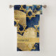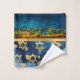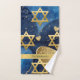 This set of towels, which you can personalize with your family name or even a short phrase like the one on the washcloth that reads "My heart is in Yerushalayim," is a luxurious addition to your bathroom. The complete set or individual towels are available for purchase. The artwork features an abstract mixed-media design, with the upper section showcasing an abstract oil painting of Jerusalem at night, separated by a golden ribbon. The lower section displays blue-hued illustrations of hearts and golden Stars of David. The overall composition exudes elegance and sophistication. Whether used during Chanukah or simply to celebrate a love for Jerusalem any time of the year, it’s a beautiful enhancement to any bathroom décor. This towel set also makes a thoughtful gift for any occasion—weddings, anniversaries, or as a token of appreciation for the host of that special dinner you’re attending.