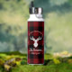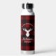 The product design features a silhouette of a deer on a classic red and black buffalo plaid pattern. Combined with your own personalised text, this composition makes a rustic, modern, and unique water bottle - Gift idea for Thanksgiving, Christmas, family reunion, or any other special gatherings!