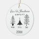 Celebrate your first Christmas as a family of three with this elegant modern Scandinavian ornament. Featuring three minimalist black-and-white Christmas tree line drawings, each tree with a family member’s name, and the year appears at the bottom. This round ceramic ornament is a stylish and timeless keepsake, perfect for new parents, grandparents, or friends with a new baby gifting a thoughtful holiday decoration. Ideal for contemporary holiday decor lovers and modern homes.