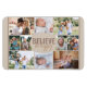 Photo Collage magnet with 10 of your favourite photos. The wording in the centre reads "believe be happy" and is lettered in bold typography and casual, skinny font script. The photo template is set up for you to add 10 pictures, which are displayed in landscape, square and portrait pictures to give you as much flexibility for placement as possible. This photo magnet has a neutral colour pallete of almond beige, mocha brown and terracotta.