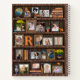 You won't find a more unique and beautiful way to display your family or wedding memories than this photo collage. This gorgeous design includes 19 of your personalised pictures, made to look like they are sitting in frames on an antique wood bookcase. Your photos are surrounded by images of vintage books and other decor, including a globe, a clock, animal figurines, flowers, and more. Your monogram sits on the middle shelf. The colours are mostly brown, orange, blue, and yellow. HOW TO PERSONALIZE: Use the simple templates. Just follow the instructions and your photos will fill the frames. Tip: Any photo shape will fill each frame (so if you upload a square in the place of a vertical, it will still fill the frame, but some will be cut off). For help, contact PictureCollage.