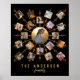 This beautiful, personalized poster includes room for 21 of your square, Instagram - style photos. It has a unique circular shape in black with faux (printed) gold glitter frames. 20 of your own photographs circle around one larger photo in the center. It's perfect for displaying family pictures or memories from your wedding and honeymoon. Use the easy templates to add your custom square photos and family name (or other text). Display your memories with this simply elegant, custom poster.