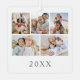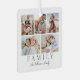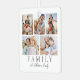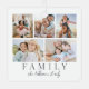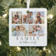 This simple and elegant boho-inspired square Christmas ornament is a beautiful way to celebrate family during the holidays. The design features a collage layout with space for five photos on both the front and back, making it a double-sided keepsake full of memories. "Family" is displayed underneath the collage in a classic serif font, and there’s room in soft script to add your family name, first names, or a short message.