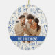 Make your tree extra special with a cute doodle Christmas ornament. A warm cream backdrop and quirky blue illustrations of Santa, a gingerbread house, gifts, bells, snowflakes, stockings, nutcracker, and candy canes frame a precious photo and your family name at the centre. add this one-of-a-kind ornament to your holiday collection today.