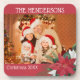 Poinsettia metal family photos Christmas beverage coaster with year and stylish red and white floral clip art.