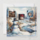 Cute watercolor, chubby snowman wearing a black top hat and blue and red scarf. He is standing next to a river, in a field covered with snow.