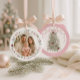Celebrate a milestone you’ll treasure forever with this sweet Family Christmas Ornament. Designed with a soft pink border and delicate watercolor details, one side features a festive Christmas tree topped with a ribbon bow and personalized with the year. The reverse side showcases your favorite photo, framed with matching ornaments, greenery, and bows. Capture the magic of your little one’s first holiday season with a personalized ornament that will sparkle on your tree year after year.