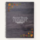 Rustic wood look family recipes cookbook- Rustic photo background of barn woodgrain pattern. Opposite corners are adorned with autumn leaves design in fall colours of golden yellow, orange, red, green, and brown. Custom family name is centred in white script and reads 'cookbook' underneath with an elegant, white scrolls design below. Back has matching rustic wood background. Note: All images are printed. Not actual wood. Inside pages are printed specifically for recipes, ready for you to fill in. Perfect Christmas family gift, Mother's Day gift, gift for just married children, for family reunions, autumn bridal shower gift, fall season housewarming gift, gift for newlyweds, gift for chef, and just the personalised notebook for saving Mum's recipes. Rustic country style, but elegant, too. Will appeal to many different tastes. Will look great in both a rustic country cabin, or elegant kitchen decor. Visit our online Zazzle.com/angela65 shop for more kitchen designs and family recipe notebooks.