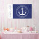 Welcome your family reunion guests with this nautical themed banner. This design features navy blue background. On the left it reads "Welcome" with vertical blue text on white. On the right is a circular emblem with a white anchor in the middle. In curved text it has your family name, on either side of the anchor is the year your family was established and below is the town and state you are from. Enjoy!
