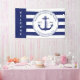 Welcome your family reunion guests with this nautical themed banner. This design features a navy blue and white striped background. On the left it says "Welcome" with vertical white text on navy blue. On the right is a circular emblem with a blue anchor in the middle. In curved text it has your family name, on either side of the anchor is the year your family was established and below is the town and state you are from. Enjoy!