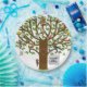 Creative family reunion summer party plates featuring tree filled with funny colourful birds. To personalise edit text to add name.