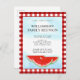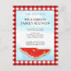 This unique invitation postcard is decorated with watercolor watermelons and a blue sky on a red and white buffalo check background.