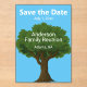 ''Save the Date' is at the top. A large tree is the background for your personalised text such as your family's last name, reunion date, and place of the reunion.