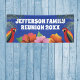 Family Reunion party banner with a tropical island beach theme with palm tree fronds, hibiscus flowers, and two bright coloured parrots. Edit the text to suit your occasion. Great for a beach reunion, luau or tiki theme party.