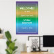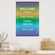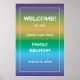 Family Reunion Welcome Sign on blue green blend colourful background. Fully customisable text to personalise for your family event. Poster can be hung on wall or door, or mounted to board or easel at the entry to your party.