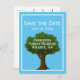 ''Save the Date' is at the top of this blue postcard. A large tree is the background for your personalised text such as your family's last name, reunion date and place.