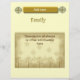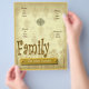 This flyer celebrates family. It has a vintage scrapbook look with a tan and gold colour scheme. Download your own images or just remove the text and add your other elements by hand later. Edit the text, use a plain colour background if desired. The background is tea stained tan colour with a subtle typography with family relationships. There is also a faint silhouette of trees along the bottom. There is a gold medallion in the centre of the upper part of the design. You can remove the medallion for a more plain look. You can also add information on the back.