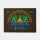 This personalised doormat is perfect for a family who loves camping and the outdoors. It has a sun ray motif in orange above a scene that includes pine trees, a tent and four stick figures peeking out from behind the tent or roasting hot dogs over a fire.