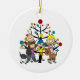 Stick figure family with dad, mom, two children...a boy and a girl, and two family dogs in front of holiday tree.