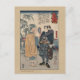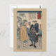 Japanese woodcut in colour, by the artist Kuniyoshi Utagawa. Image is of a man holding up a magnifying glass to look at the famous samurai swordsman Miyamoto Musashi. Created between 1847 and 1850. Artwork from the Library of Congress, card design