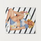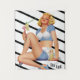 The portrait of the young lady has her wearing a striped blue and white top with the bra section being all white, with matching short pants and a white button skirt, as well as blue and white striped open toe and heel platform shoes; that are also have blue and white soles.
