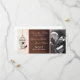 These save the date wedding photo cards feature a fanciful birdcage with swirls and a pink heart, and two cute birds, in chocolate brown, hanging against an ivory, textured paper background with faded handwriting. A shiny, pale pink ribbon separates a chocolate brown sidebar, which contains the wedding invitation wording in ivory and pink. The invitation wording, in alternating script and classic serif fonts, and couple's engagement photo are completely customisable.
