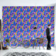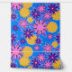 Fanciful pink and purple and yellow flowers with white outline on blue.