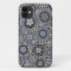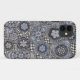 A phone case with a denim blue coloured floral pattern on top of a grey and white chequerboard pattern.