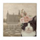 Vintage sepia tint background photo of a castle with manicured gardens and overlay of beautiful fancy black and white cat with floral crown