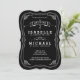 A lovely vintage-themed chalkboard style modern wedding invitation that incorporates charming typography and scrolling frames and banners to highlight your wedding celebration. Perfect for any chalkboard theme, rustic, barn or country style wedding; the white text on the black background makes a modern, yet vintage statement. Lovely curving text adds interest and makes your details stand out. Look for all our coordinating "Fancy Chalkboard" products such as wedding programs, menus, response cards, seating cards, table number cards, stickers, gift boxes, napkins, address labels and postage - everything you need to create a beautiful matching ensemble for your entire wedding celebration.