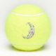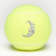 These tennis balls have a white fancy crescent moon with colourful abstract shapes in yellow, blue, and purple, three stars and a face with blue eyes and pink lips on the front and back.