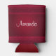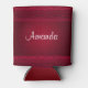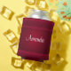 Personalised can cooler with a red background decorated with elegant swirls and ornamental designs along the borders.