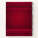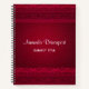 A personalised spiral notebook with a red background decorated with elegant swirls and ornamental designs along the borders.