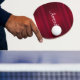 Ping pong paddle with a red background decorated with elegant swirls and ornamental designs along the borders.