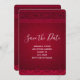 Wedding save the date card with a red background decorated with elegant swirls and ornamental designs along the borders.