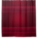 A shower curtain with a red background decorated with elegant swirls and ornamental designs along the borders.