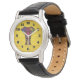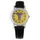A womans watch with an eastern elephant illustration with bright and bold colours filled with decorative floral and mandela style pattern. Set on a warm yellow background with faint distressed looking stripes.